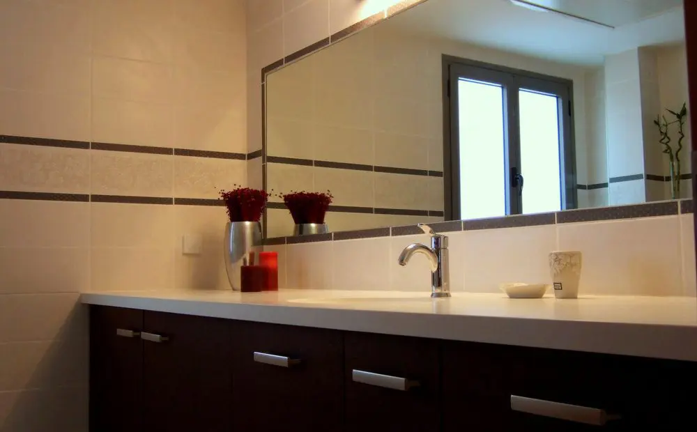 החדר תוכנן בגוונים של לבן ואפור בהיר ובקונטרסט לארון שנצבע בגוון וונגה כהה. הכיור והשיש הלבן תוכננו כיחידה אחת