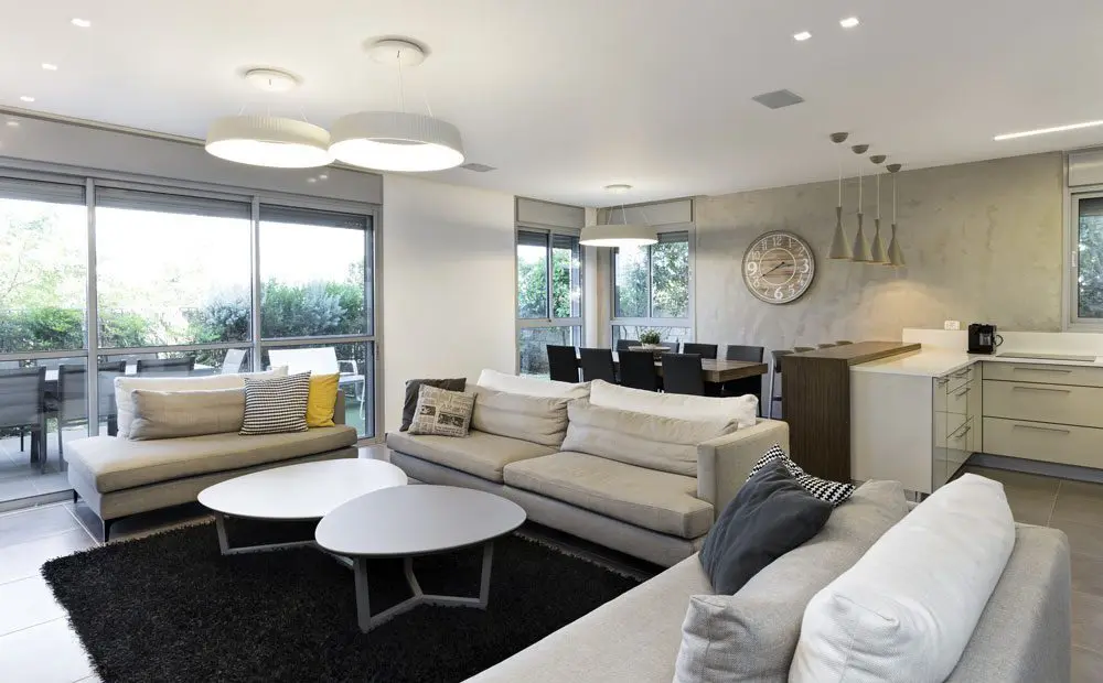 החלל נקי, מודרני עם נגיעות צבע חם. כל הצבעים שנבחרו לריהוט, לגופי התאורה ולצבעי הקירות משתלבים באופן הרמוני ונעים.