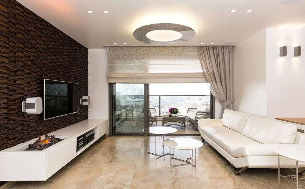 סלון בהרמוניה של צבעים עם ריצוף דמוי שיש