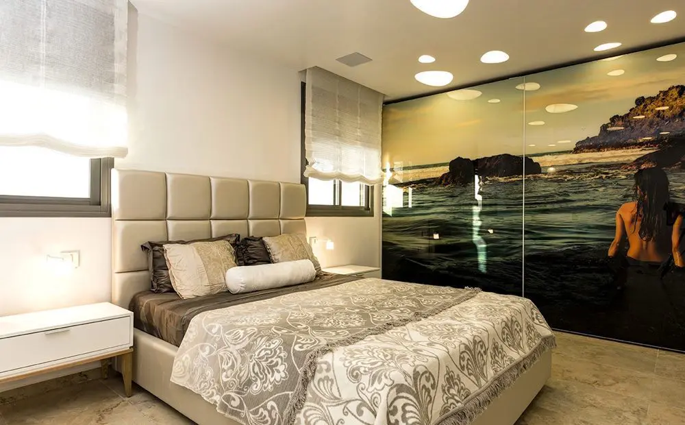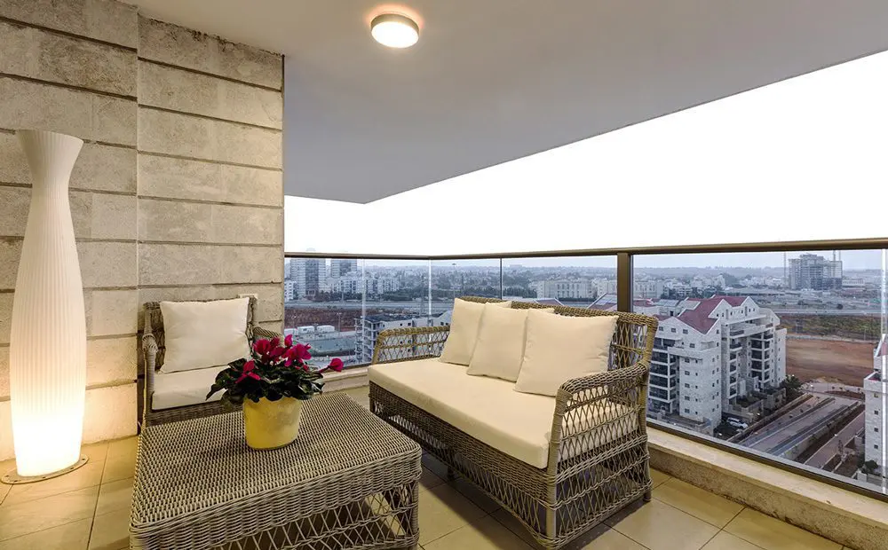 דירה יוקרתית משקיפה ממרומי קומה 14 על מרחבי כפר סבא הירוקה עיצוב הדירה התבסס על הנוף האורבני הנשקף מחלונות הדירה