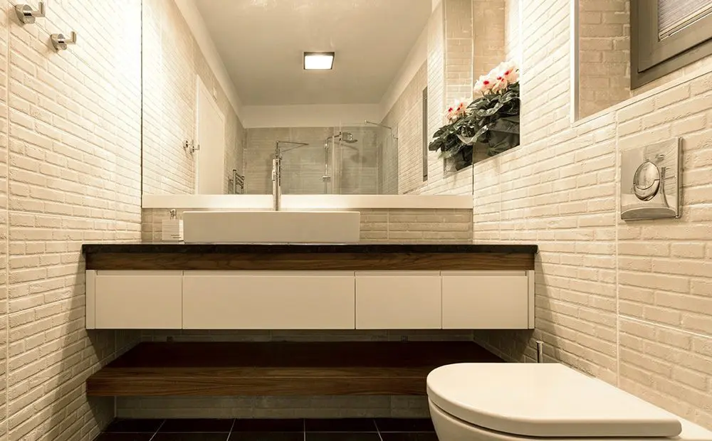 קיר הטלוויזיה חופה בבריקים מעץ גושני ספרדי איכותי וממנו מובלט מסך הלד