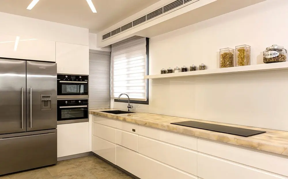 למטבח הלבן נבחר שיש קונצ'טו אשר הואר בפסי לד. השיש משתלב עם ריצוף האבן שנבחר לדירה כולה.