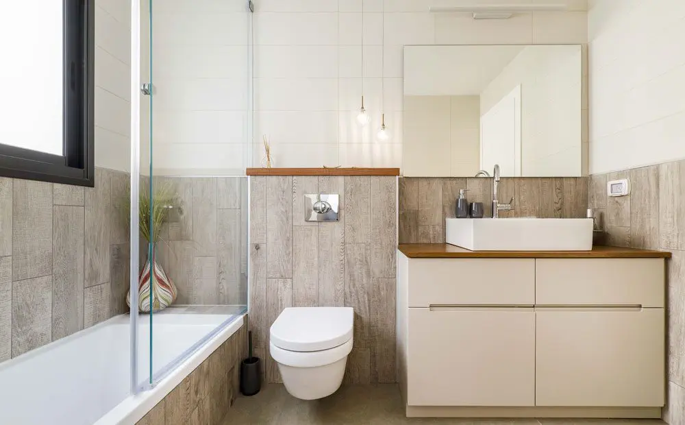 חדר רחצה מואר המעוצב בגוונים בהירים עם שילובי עץ