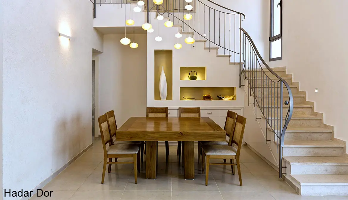 פינת אוכל ונישות גבס מתחת למדרגות בשילוב תאורה מרגשת