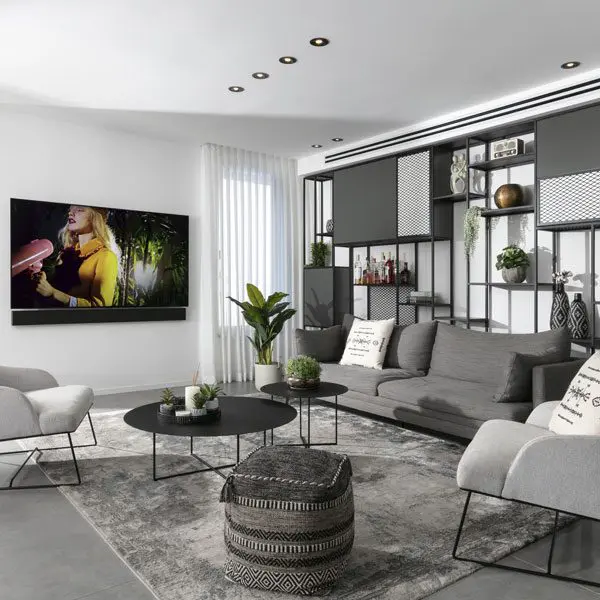 עיצבנו את הבית בצבעים מונוכרומטיים: שילבנו הרבה אפור ושחור לצד הקירות הלבנים. בחרנו באריחים גדולים לריצוף, תכננו מטבח גדול, יצרנו מדרגות קלות עם מעקה מיוחד. יצרנו הנמכת גבס לגופי תאורה שקועים, ליצירת אווירה נעימה בבית.